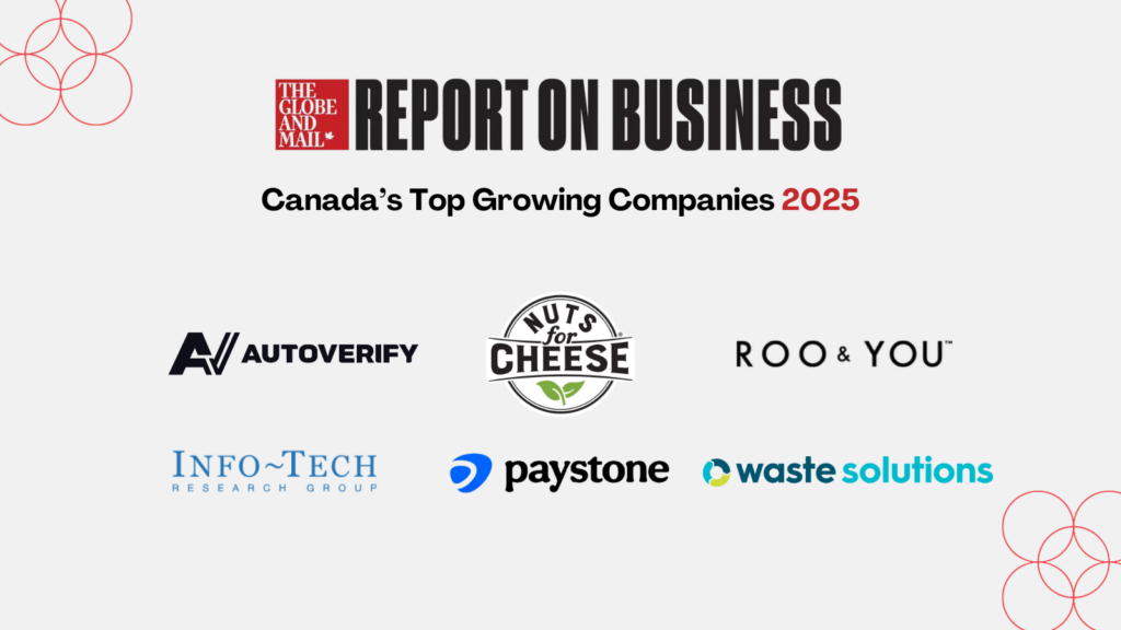 As the podium of record for technology and this region’s innovation corridor, TechAlliance of Southwestern Ontario is exceptionally proud to call attention to six London-headquartered companies have been recognized in The Report on Business – Canada’s Top Growing Companies 2025. Autoverify, Info-Tech Research Group, Nuts for Cheese, Paystone, Roo & You and Waste Solutions Canada are among 400 high-potential Canadian companies.
